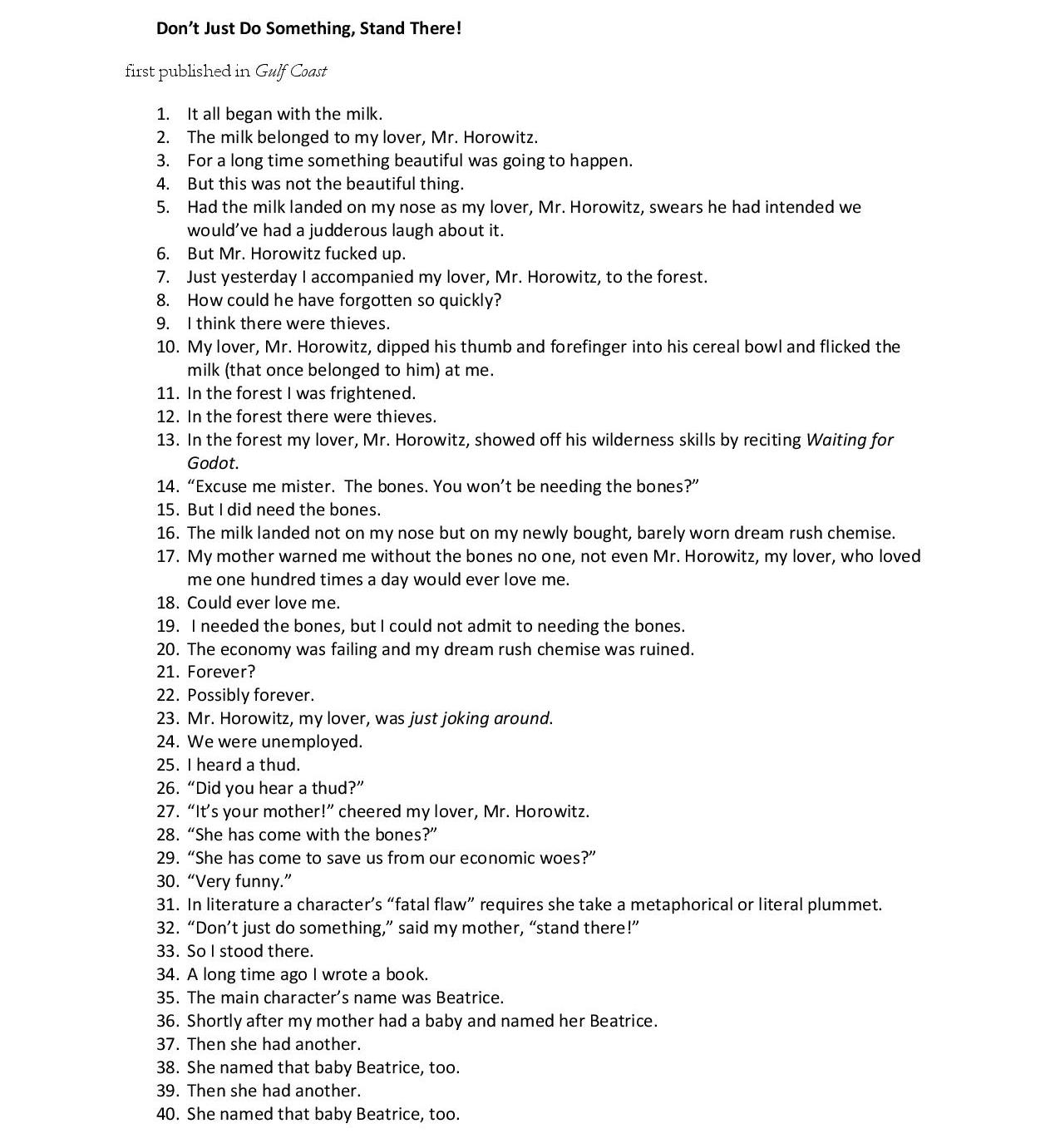 9) In the poem, “Don’t Just Do Something, Stand There,” we encounter a list: “58. There are stains that happen suddenly, and can never be washed out. / 59. ‘And if they could?’ / 60. ‘We would be saved.’ / 61. ‘For god’s sake,’ said my mother, ‘Mr. Horowitz, your lover, was just joking around.’ 62. Speaking of jokes, let me tell you a joke I once heard at a funeral. / 63. His wife had died young and he told the joke at the funeral because she loved the joke, every day she loved the joke, and now he had to live a life he couldn’t bear to live without her so he told the joke.” The joke here is used to displace the suffering. The characters metaphysically shift out of their positions in the stories to critically stimulate discussion. This incorporates change and agency, the characters at once become the fool of their folly and the vehicle for their growth. I am interested why you chose to place these dynamics in the form of a list. How does this affect the internalization of the message in both the reader and the characters?