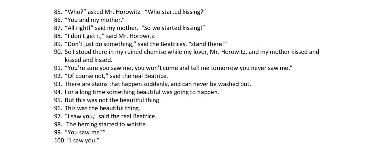 1. Beatrice softens her grief by allowing her most intimate parts (limbs, heart, Walter B., her offspring or what springs off her) to approach her as a stranger might approach – shy, uncertain, and nameless. Even her own name approaches her namelessly. Sometimes when I visit Beatrice she won’t open the door. Sometimes she swears she has never even heard of me.